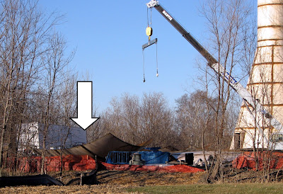 Before the 12 plus inches of powdery snow that made skiers, snowboarders and snowmobilers alike shout in exuberant exclamation hit Forest Lake this weekend, I snapped a shot of one of the huge sections on the ground that was being prepared to be lifted into place for the top of the tower. It is directly under the arrow. Can you see the edge of it coming up near the crane? It's HUGE!